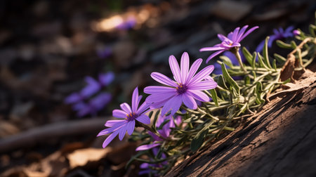 Delicate purple flowers open up under the warm sun, surrounded by fresh green leaves and soil.