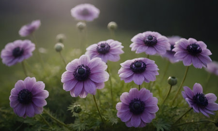 Purple anemone flowers blooming in a meadow.