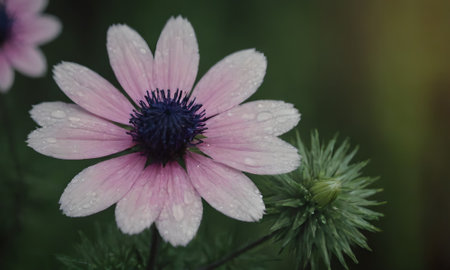 Beautiful pink anemone flower with dew drops close up
