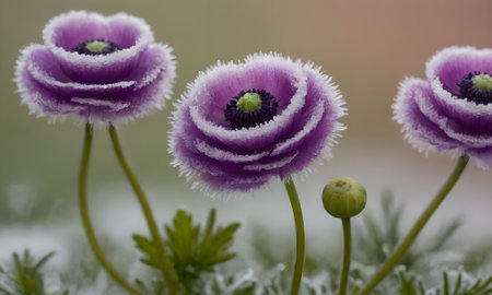 Close up of purple anemone flowers covered with hoarfrost