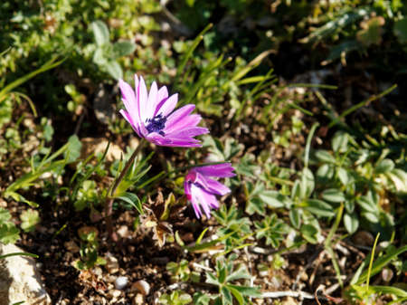 Purple anemone flowers blooming in the garden in spring