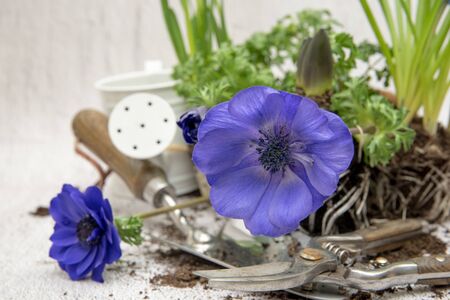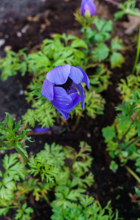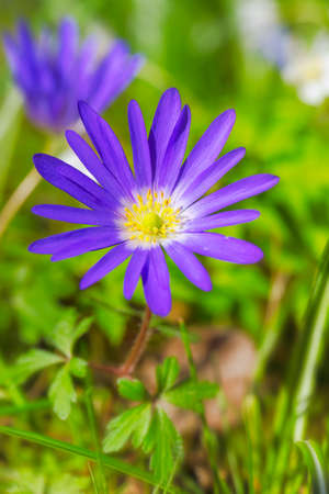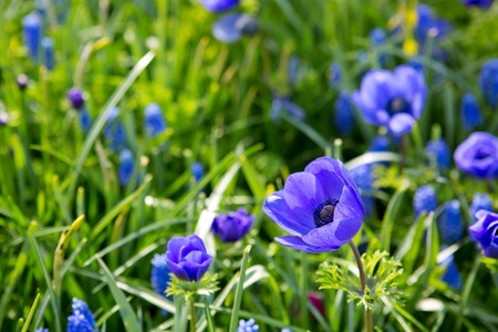 Blue violet anemone flowers in garden. Spring flower blooming