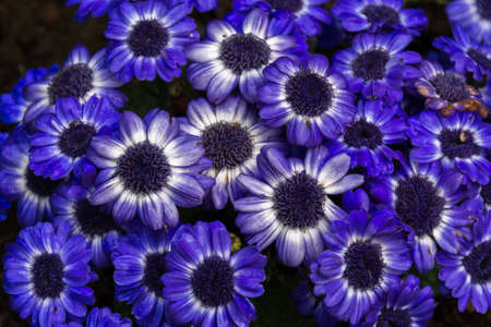 Beautiful closeup view of yellow stigma of blue common daisy (Bellis perennis) flower Ballinteer, Dublin, Ireland. Soft and selective focus macro