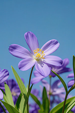 purple crocus flower on blue sky background, close-up