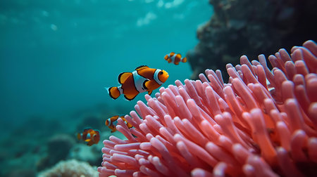 Vibrant clownfish swim gracefully among colorful anemones in a sunlit coral reef ecosystem