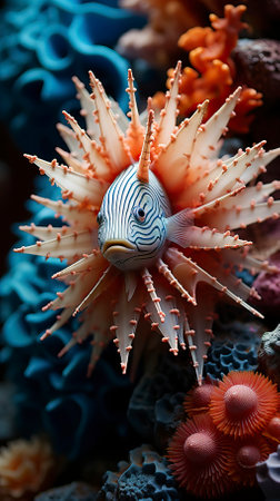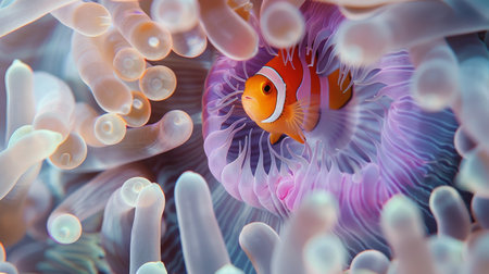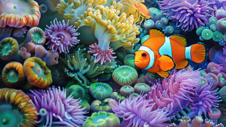 A stunning clownfish nestled among vibrant sea anemones, showcasing the beauty of marine life in a peaceful underwater environment filled with color and tranquility.