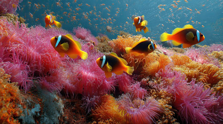 Several clownfish, distinguished by their orange bodies and black markings, swim near vivid pink and orange sea anemones. The underwater scene features a multitude of small, orange fish in the background. The composition is well-lit and suitable for use in environmental, educational, or decorative projects.