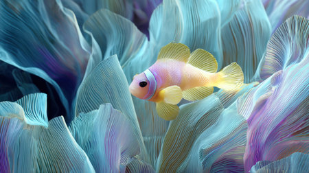 A stunning illustration of a colorful fish navigating through soft, abstract waves in shades of blue and lavender, creating a serene underwater fantasy scene.