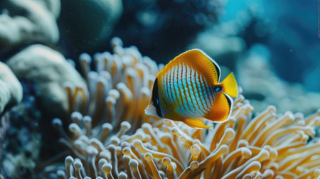 A vibrant fish glides gracefully through a colorful coral reef, showcasing the intricate beauty of marine life in an underwater ecosystem.