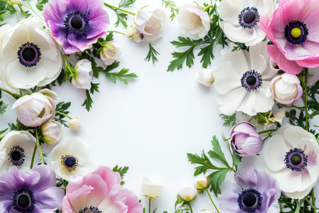 Frame Of Anemones On White Background, Lots Of Space Inside