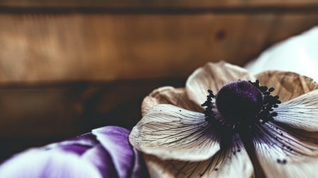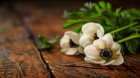 Beautiful white anemone flowers arranged with fresh green parsley on rustic wooden table create serene and natural atmosphere. delicate petals and contrasting colors evoke sense of tranquility