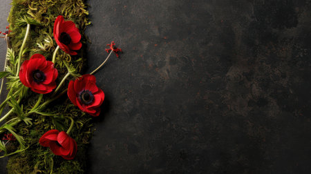 Vibrant red anemone flowers arranged on dark textured surface, surrounded by lush green moss, create striking contrast. composition evokes sense of natural beauty and elegance