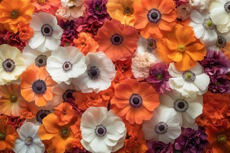 Close-up of colorful anemones and carnations, arranged in a floral pattern.