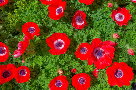 Red poppy anemone flowers in bloom close up in the garden, directly from above