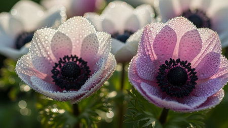 A macro showcases delicate pink anemone flowers adorned with glistening water droplets, highlighting their intricate...