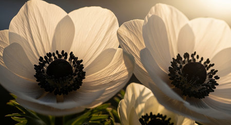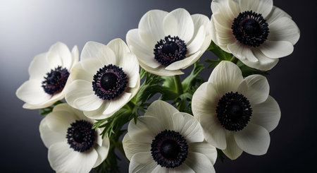 AI Generated. close up of white anemones with deep navy blue accents