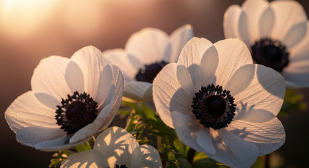 White anemones in the sunlight, close-up, macro