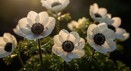 Gentle showing delicate white anemone flowers with dew drops glistening in the soft morning sunlight keywords: white...