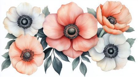 Bouquet of poppies and anemones. Isolated on white background.