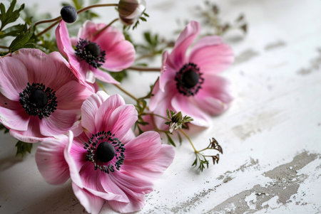 With showing delicate white anemone flowers with dark centers and green leaves against a textured white wall...