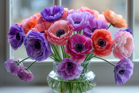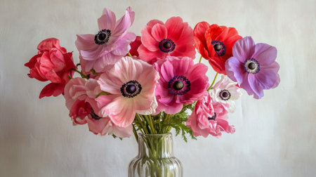 A stunning arrangement of vibrant anemone flowers in shades of purple, pink, and red fills a clear glass vase, creating a joyful and lively atmosphere on a bright, soft background.
