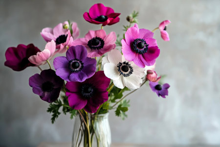 Beautiful arrangement of colorful flowers including red, white, and yellow anemones, showcasing their vibrant petals and delicate details against neutral background