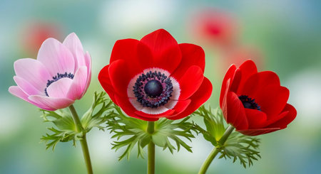 Red and white anemone flowers on green background with copy space
