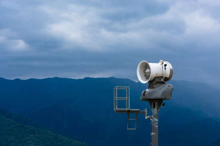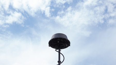 Beach megaphone speaker siren on a sunny day with bright blue sky and clouds.