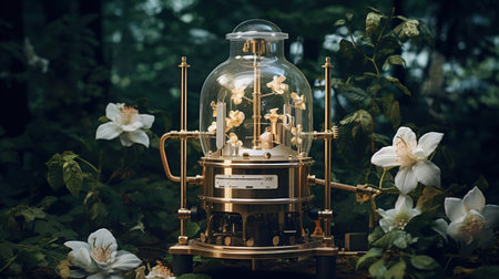 Generative AI, Essential oil extraction with distillery machine with jasmine white flowers