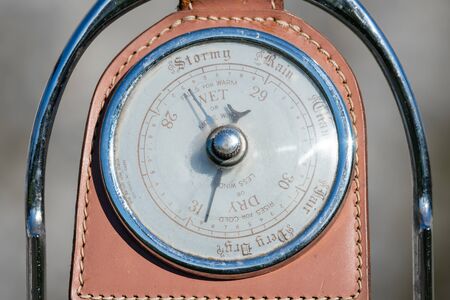 Close up of an antique barometer made out of an old horses stirrup indicating high pressure