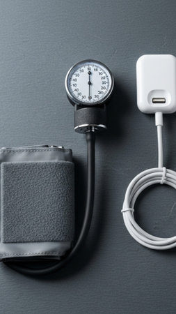 A vertical, wide-angle still life capturing the integration of old and new health monitoring methods