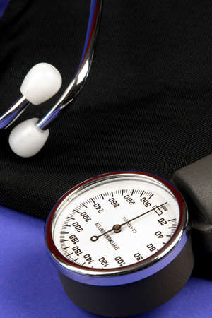 Blood pressure meter and stethoscope on blue background