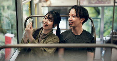 Couple, happy and photography with smartphone in cable car for adventure, sightseeing and explore in Japan. People, relationship and smile or satisfied with nature pictures for vlog post and bonding