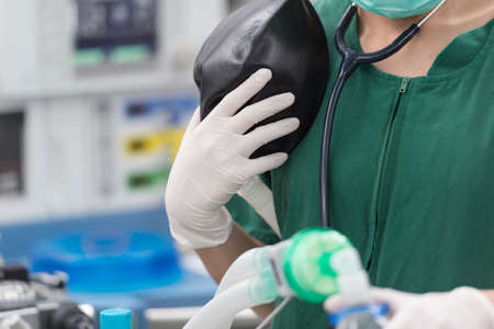 Closeup hands of doctor and assistant holding oxygen mask with patient emergency in the operation room at hospital, surgeon healing and surgery, problem of breathing, instruments medical and health.