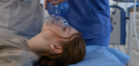Anesthesiologist makes a general anesthesia to a patient before the surgery pushing a mask to his face with assistant prepares an intubation instrument in foreground close-up