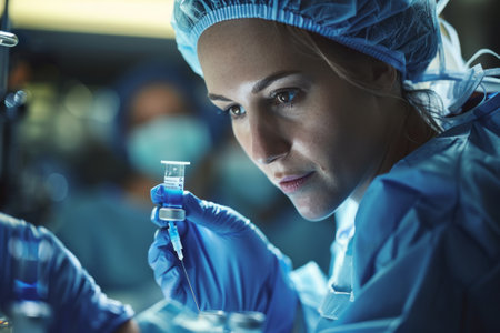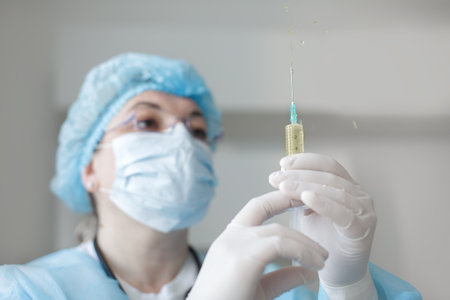 Female surgeon wearing surgical mask holding needle and syringe preparing for surgery in operating room