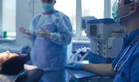Anesthesiologist prepares the patient for surgery in hospital. Healthcare pandemic people concept