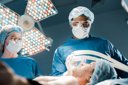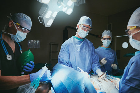 Team of experienced surgeons with surgical mask working together in a operation room. Medical staff of professional surgeons wearing protection and surgical cap while performing surgery on a patient in the operation theater. Group of surgeons at work while anesthetist holding oxygen mask on patient.