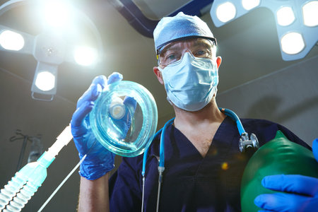 Low angle, portrait or surgeon in hospital with oxygen mask, breathing or anesthesia support in medical operation. Healthcare, POV or man with equipment, patient safety or sedation for surgery