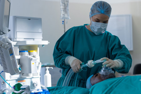 Caucasian female surgeon placing anaesthetic face mask on patient in operating theatre at hospital. Hospital, surgery, hygiene, medicine, healthcare and work, unaltered.