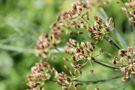 Closeup of fresh dill garden umbrellas. Background with dill umbrellas. ripening dill seeds.