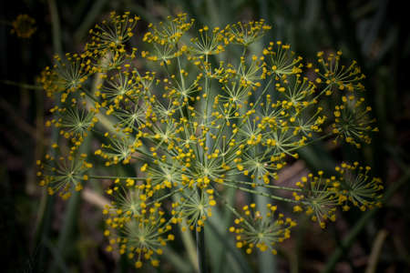 Macro closeup of flowering delicate dill herb cluster flowers growing in garden