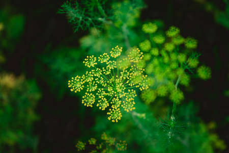 Close up of blooming dill flowers in seasoning kitchen garden. Fresh fennel blossoms on the blurred background. Selective focus