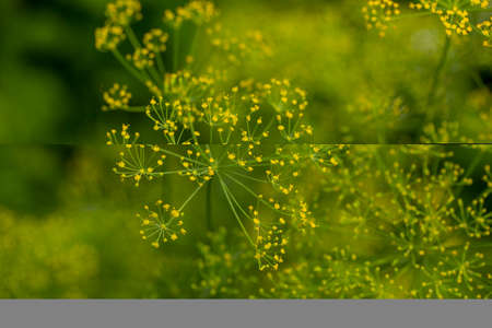 Macro shot of blossoming dill plants in a greenhouse on a sunny summer day on a colorful, bright and vibrant background