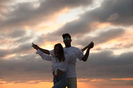 Happy couple dancing outdoors during beautiful sunset