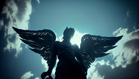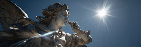 A marble angel sculpture elegantly blows a trumpet, illuminated by radiant sunlight from behind, creating a peaceful atmosphere.