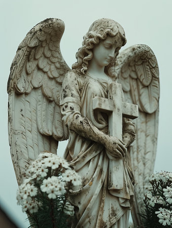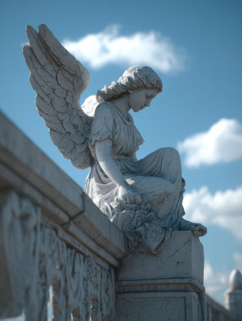 A beautifully crafted angel sculpture sits gracefully at the entrance gate, providing a watchful presence against a backdrop of clear skies and soft clouds.