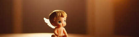 Illustration of greeting card of figurine of cute, funny baby cupid angel with gold curly hair on pastel colors background. Promotion, shopping template for love and valentines, mothers day concept
