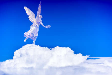 A female angel with big white glowing wings is sitting in the clouds in the sky. Faith religion heaven love forgiveness concept.