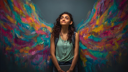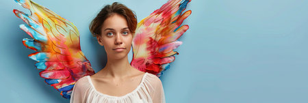 Inspirational conceptual portrait of young woman with vibrant abstract painted wings, symbolizing creativity, freedom, imagination, and artistic self expression power.
